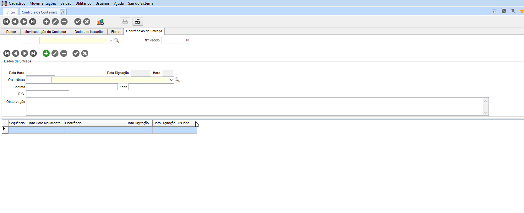 Na guia Ocorrências de Entrega, temos as informações dos Dados de Entrega, onde apresenta os dados do movimento de entrega do container, com os campos: Data, Hora, Ocorrência, Contato, Telefone, RG e Observação.