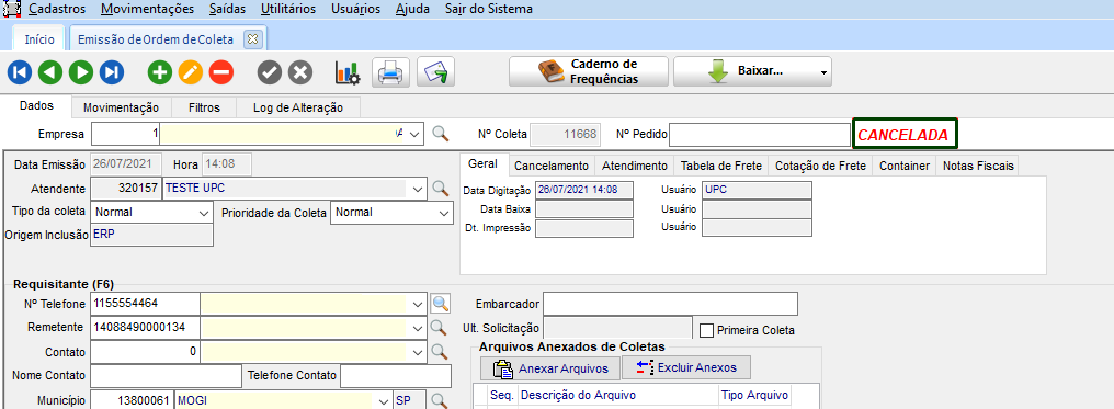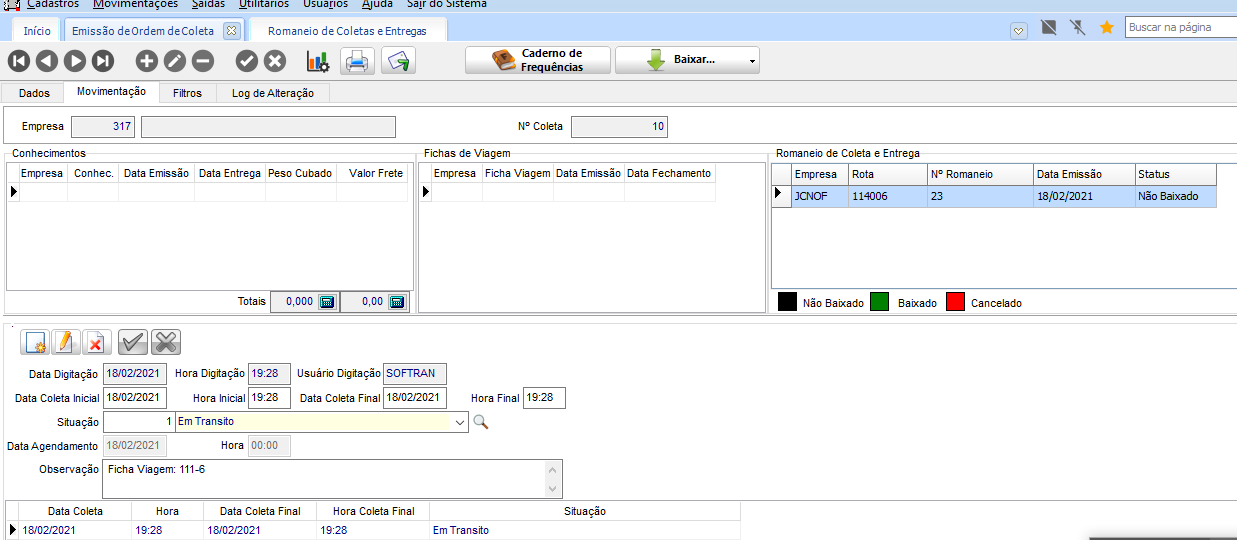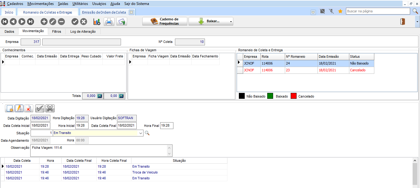 Na coleta que registra o romaneio atual (nr. 24), na guia Movimentação, apresenta os históricos (conforme o que foi configurado no CFG) bem como o cancelamento do romaneio anterior com a mudança para o romaneio atual.