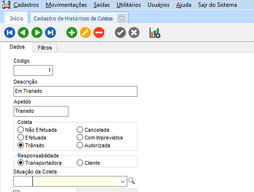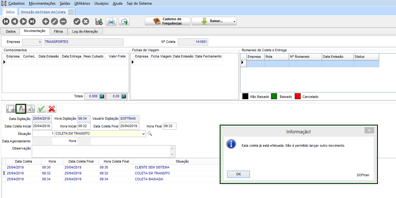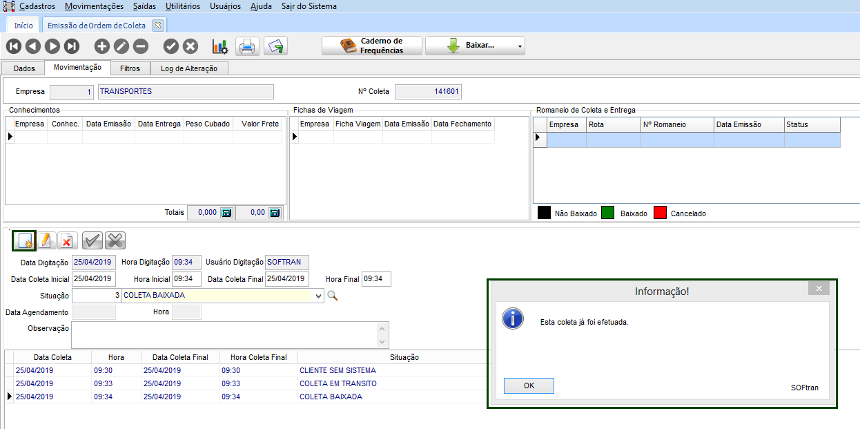 Na tela de Ordem de Coleta, na guia Movimentações, ter diferentes situações cadastradas, ou ter a coleta com a situação de “Baixada” ao qual já foi efetuada a entrega.