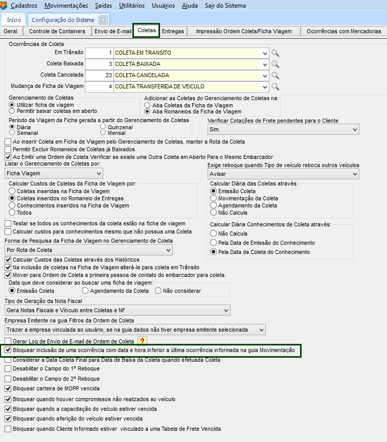 Quando esta configuração estiver marcada, o sistema apresenta mensagem para o usuário, quando for adicionado uma nova movimentação na ordem de coleta e esta tenha data/hora menor que a última cadastrada.