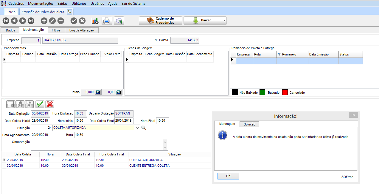 Quando na tela de Ordem de Coleta, ter mais de uma movimentação cadastrada na guia correspondente. Quando realizar a alteração desta coleta, e for adicionada uma nova situação, o sistema não deve permitir quando a data/hora deste registro, for anterior ao último registro cadastrado na movimentação. Principalmente em situações de que a coleta já está baixada, desta forma não irá permitir adicionar novas movimentações