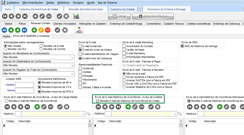 Em Movimentações > Clientes/Fornecedores > Clientes e Fornecedores, no cadastro do remetente da coleta, verifique a guia Pessoas Contato > Envio de e-mail, se existe um registro cadastrado, com a opção marcada Recebe e-mail de histórico de ocorrências de coleta.