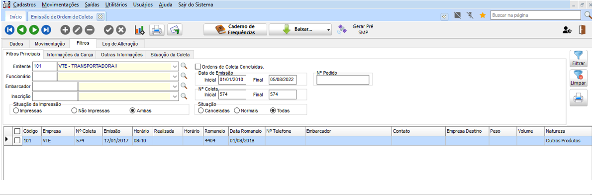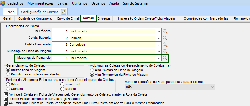 Na guia Coletas, incluído o campo Mudança de Romaneio, buscando os dados do Cadastro de Histórico de Coletas:
