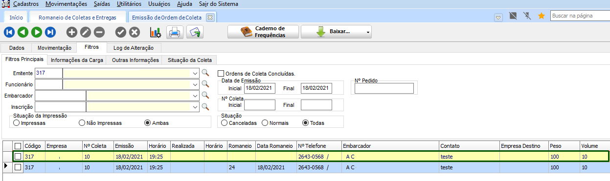 Em Movimentações > Romaneio de Coletas e Entregas, cadastrado um novo registro, adicionando a mesma coleta.