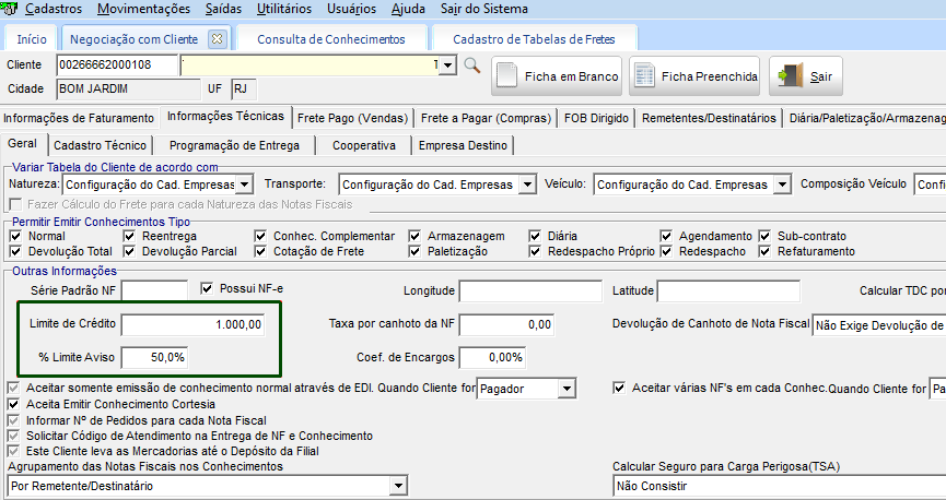 - o campo % Limite Aviso informe o valor do Limite de Crédito, que será considerado o valor total permitido para emissão dos conhecimentos e coletas. No campo %, será o valor para o aviso ao usuário, ou seja, quando chegar neste percentual, será apresentado um aviso para o usuário indicando que o valor está chegando no limite.