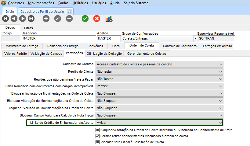 Para Ordem de Coletas, verificar a configuração em Cadastros > Usuários > Perfil do Usuário > grupo de configurações Ordem de Coleta > guia Ordem de Coleta > guia Permissões, se está marcado para avisar a configuração Limite de crédito do Embarcador em aberto.: