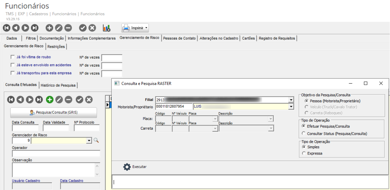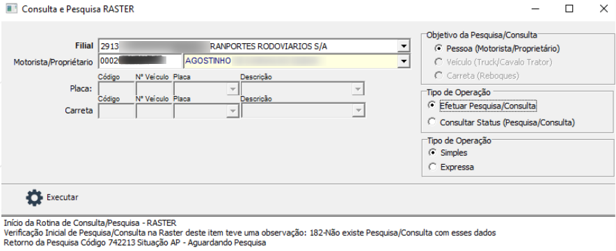 Na tela de Consulta/Pesquisa RASTER selecione tipo da Operação e clique em Executar.