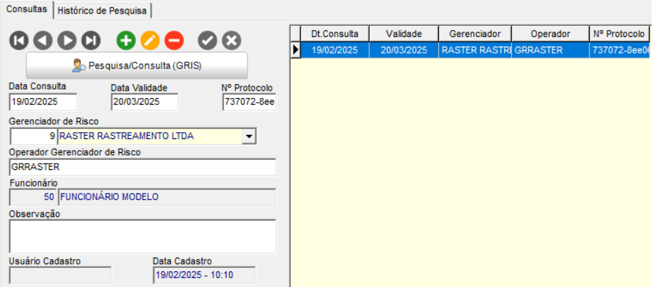 Ao concluir o processo de Pesquisa/Consulta e retornar a pesquisa com Sucesso, será gravada a Data da Consulta, a Validade e o Número do Protocolo.