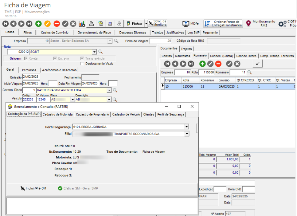 Após fazer o cadastro da Ficha de Viagem com todos os dados como Romaneio, Notas fiscais , Manifestos, ao clicar em Gerar Solicitação de SMP será exibida a tela de Gerenciamento e Consulta (Raster).