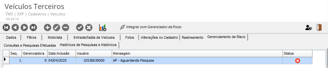 Após integrado o Cadastro do Freteiro, acesse a guia Gerenciamento de Risco e clique no botão Pesquisa/Consulta.