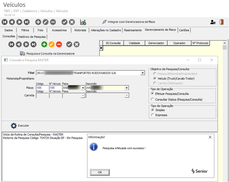 - Com veículo integrado, acesse a guia Gerenciamento de Risco e clique no botão Pesquisa e Consulta via Gerenciadora.