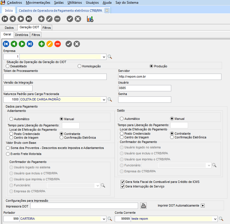 O que precisa ser configurado para realizar o Cancelamento de um título CIOT REPOM?