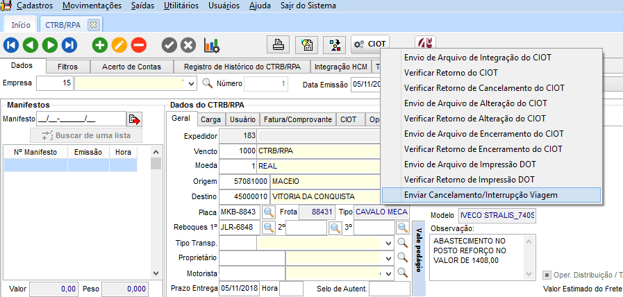 Cancelamento de um título que possui CIOT REPOM
