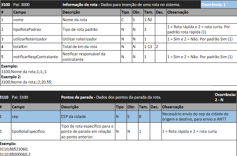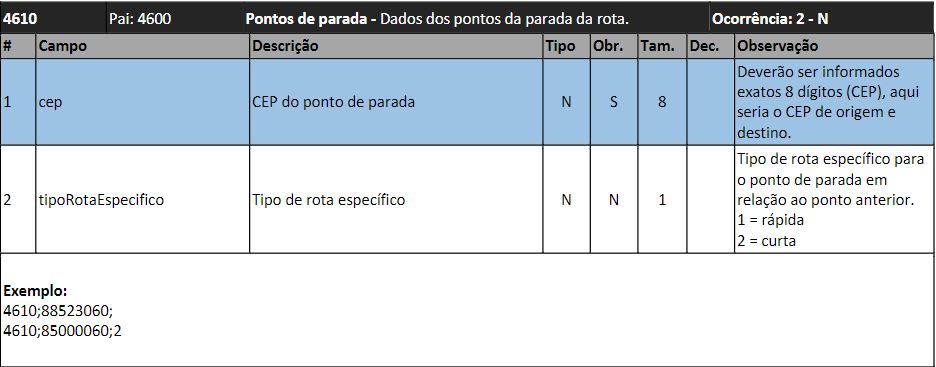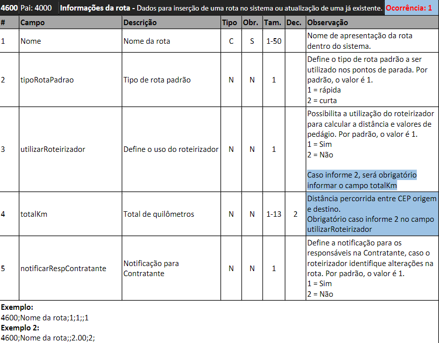 A linha 4600 se torna obrigatória. Caso a opção “utilizarRoteirizador” seja igual a 2 é obrigatório informar o campo totalKm (descrição será alterada para distância percorrida entre CEP origem destino).