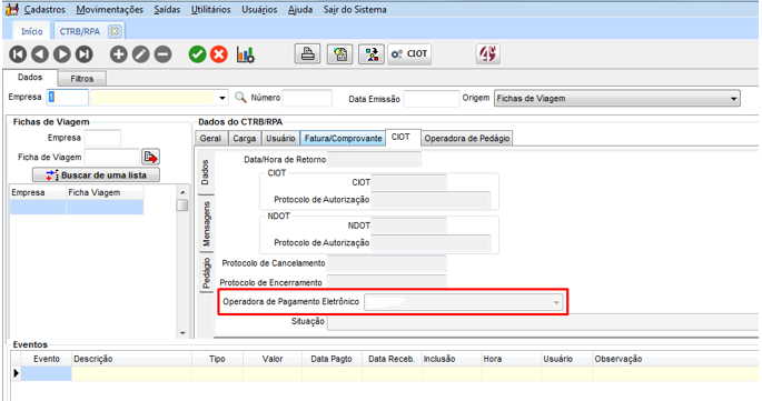 Na Guia CIOT o campo Operadora de Pagamento Eletrônico deve estar habilitado para que possa selecionar a utilizada pela sua empresa.