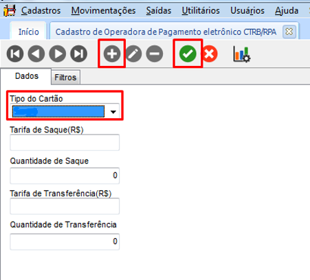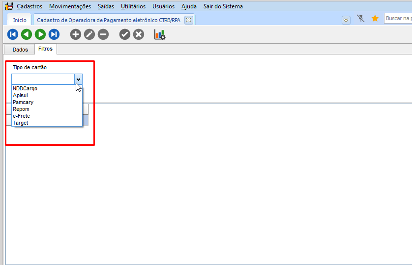 Acessar o módulo FTR, navegar até o menu de Cadastros > Cadastros Gerais > Operadoras de Pagamento Eletrônico CTRB/RPA e insera um novo registro e selecionar o Tipo do Cartão que sua empresa utiliza: