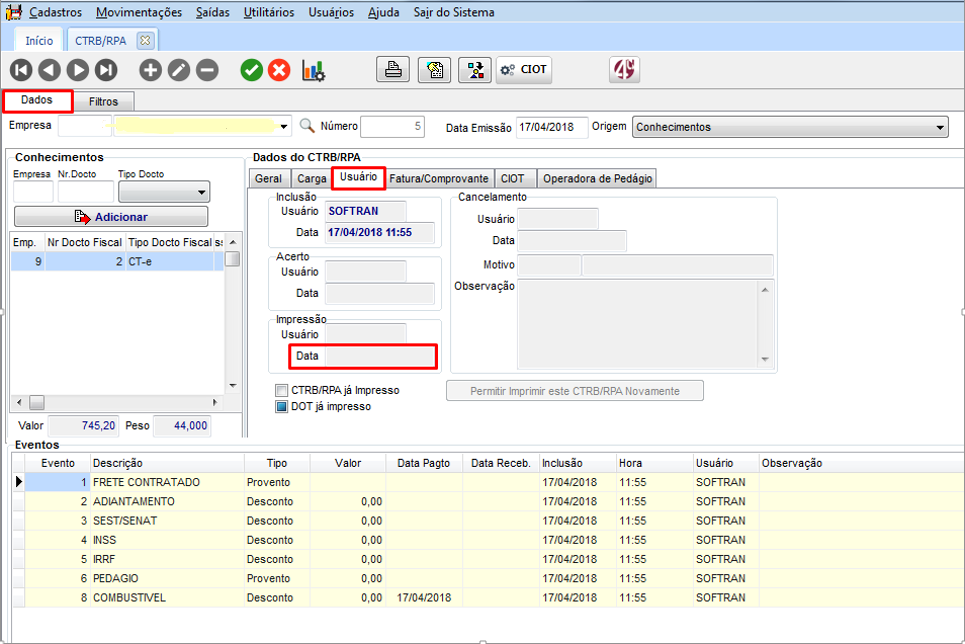 No módulo FTR, em Movimentações > CTRB/RPA > Emissão, localizar um CTRB que já tenha dados de CIOT autorizados.