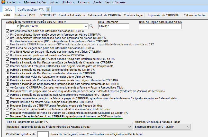 Nas configurações gerais do módulo FTR, deve estar configuração para bloquear os dados do veículo no CTRB/RPA, e quando a configuração estiver marcada, o sistema verifica se CTRB/RPA já tem CIOT gerado, se sim, não permite realizar alteração no campo Veículo, e consequentemente no campo Motorista também. Desta forma o sistema auxilia para que não haja erros no processo de pagamento entre a informação do CIOT e do CTRB/RPA.