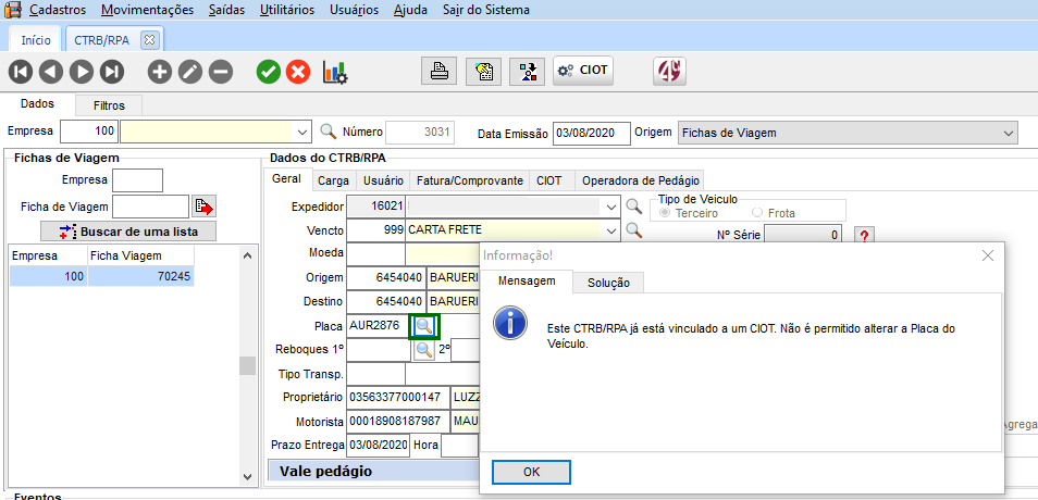 Caso seja realizado alguma alteração nos campos Veículo, Proprietário e Motorista, o sistema exibe uma mensagem ao usuário e bloqueia a alteração destes campos (pois são campos que estão interligados).