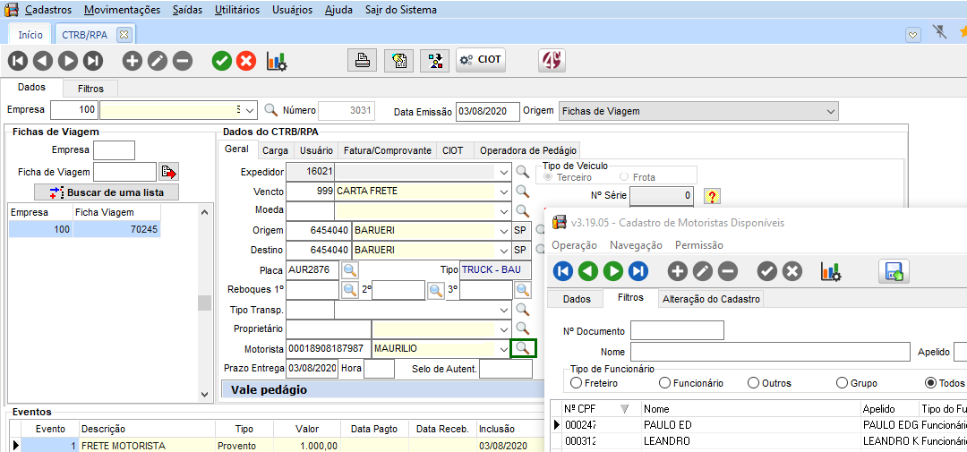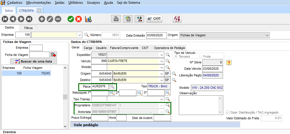 Utilizado o mesmo exemplo anterior, com o CTRB/RPA com dados do CIOT. Com isso, o sistema permite realizar a pesquisa de novos registros nos campos Veículo, Proprietário e Motorista.