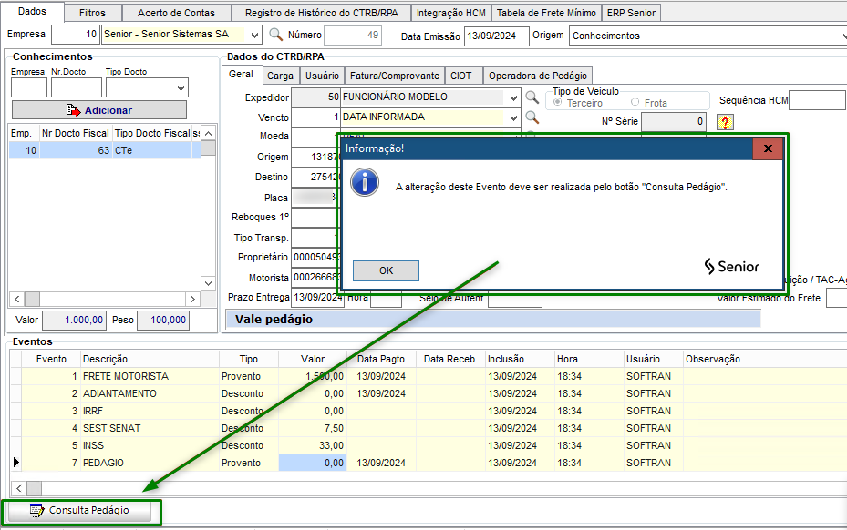 Na tela do CTRB/RPA, ao informar o valor do pedágio nos eventos, é exibida a mensagem de que a alteração deve ser realizada pelo botão Consulta Pedágio: