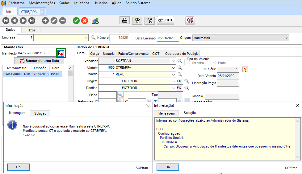 No módulo FTR em Movimentações > CTRB/RPA > Emissão, ao tentar vincular o manifesto, será feito a validação do CT-e, e apresentado mensagem em tela:
