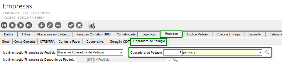 Ir para a tela de Cadastro de Empresas, guia Freteiros > Operadora de Pedágio,e configurar para que a movimentação financeira de pedágio seja gerada pela operadora de pedágio, selecionando a operadora Pamcary.