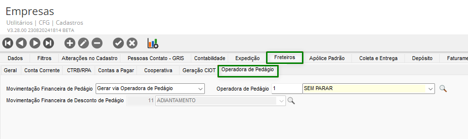 No módulo CFG, vá até Cadastros > Empresas > guia Freteiros. Nesta tela foi adicionada uma subguia chamada Operadora de Pedágio (semelhante aos campos da configuração do cadastro de freteiros). Nela são exibidos os campos: