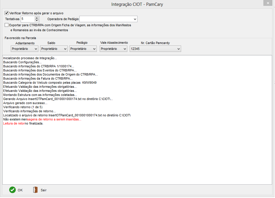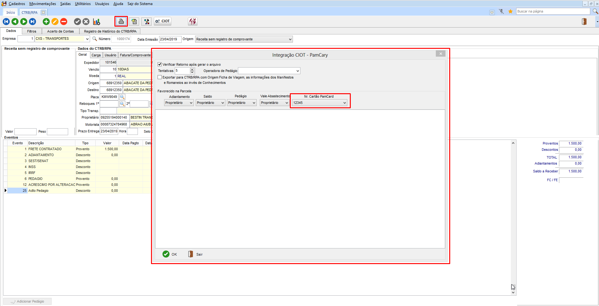Integração CIOT Pamcary (Escolha Cartão)