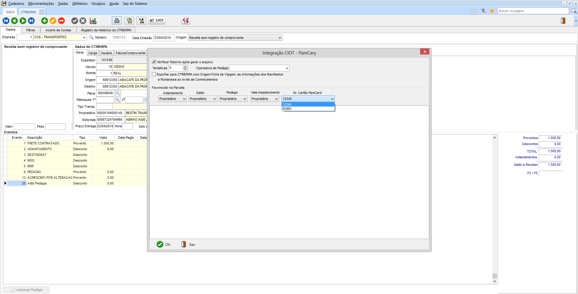 Adicionado o campo “Nr. Cartão Pamcard” na tela de Integração CIOT, onde o sistema permite selecionar qual o cartão pertence ao pagamento, apresentando a listagem dos cartões cadastrados.