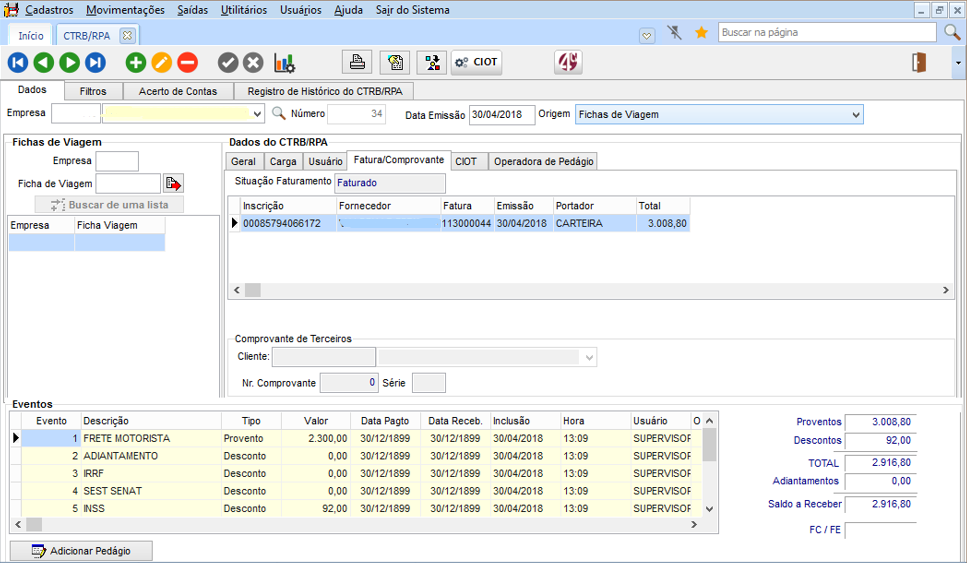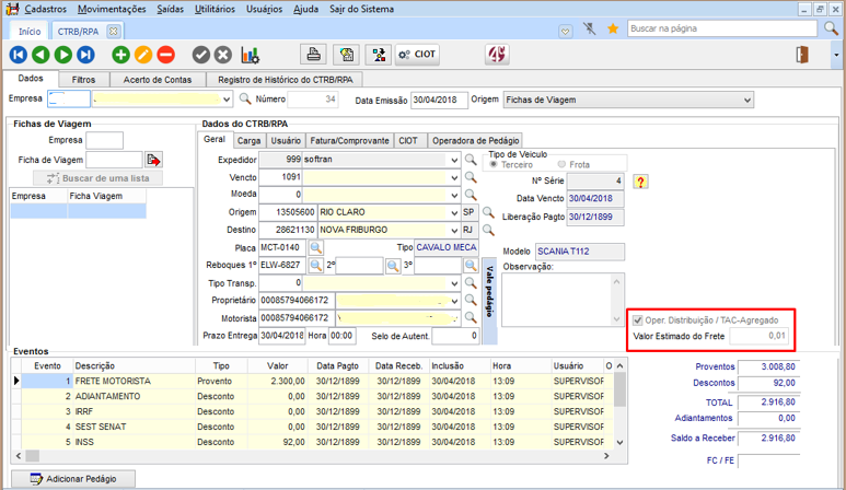 Para operações de viagem padrão, devem ser informados todos os valores antes de imprimir a CTRB/RPA, onde é gerada a fatura, títulos e CIOT.