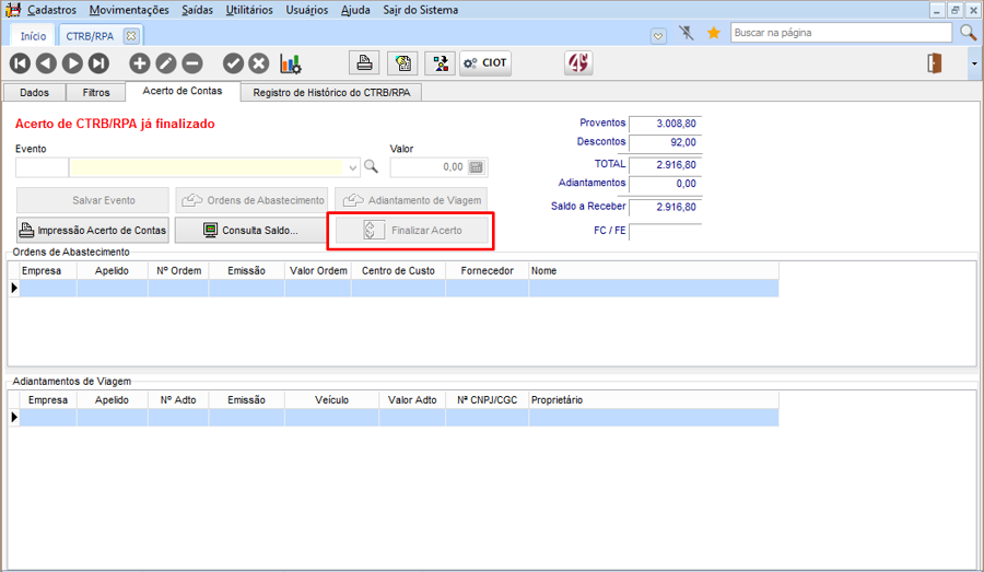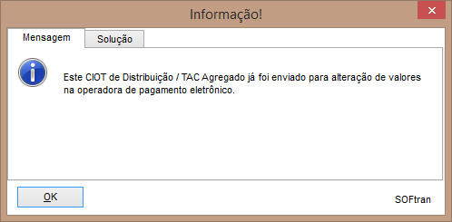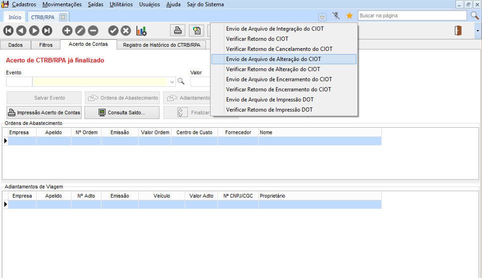 Após esse processo, deve-se encerrar o CIOT, pois somente é permitida uma alteração de valores, devido a configuração no perfil de usuário criada, não será mais possível alteração, pois evita a duplicação de valores na operação de pagamento eletrônico.