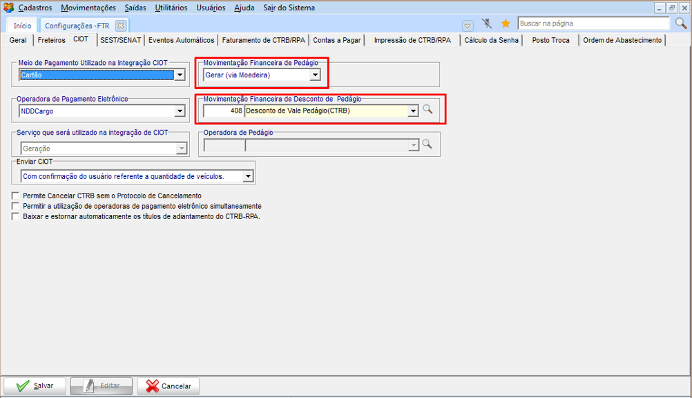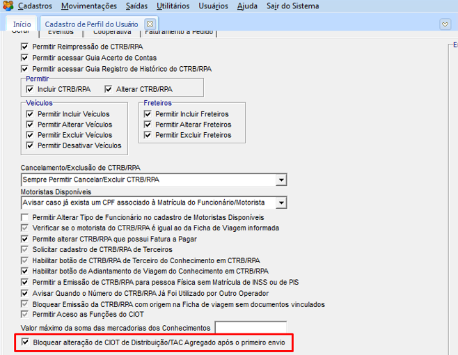 Para bloquear a alteração do CIOT após primeiro envio ou retornos, evitando duplicação de valores na NDD, as opções abaixo devem estar marcadas em CFG > Cadastro de Perfil do Usuário.