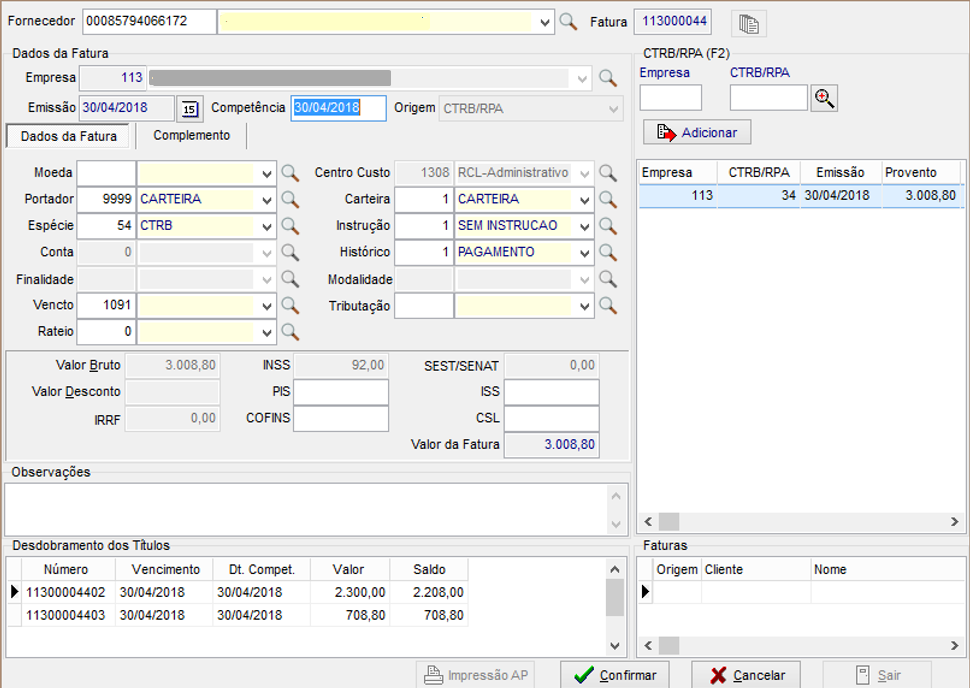 Na guia Dados mostra a fatura gerada e na subguia Dados do CTRB/RPA > Fatura/Comprovante com duplo clique abre para visualização da fatura e títulos.