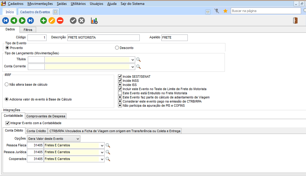 Para cadastrar o tipo de evento e Freteiro acesse FTR > Cadastros > Cadastros Gerias > Evento do CTB/RPA.