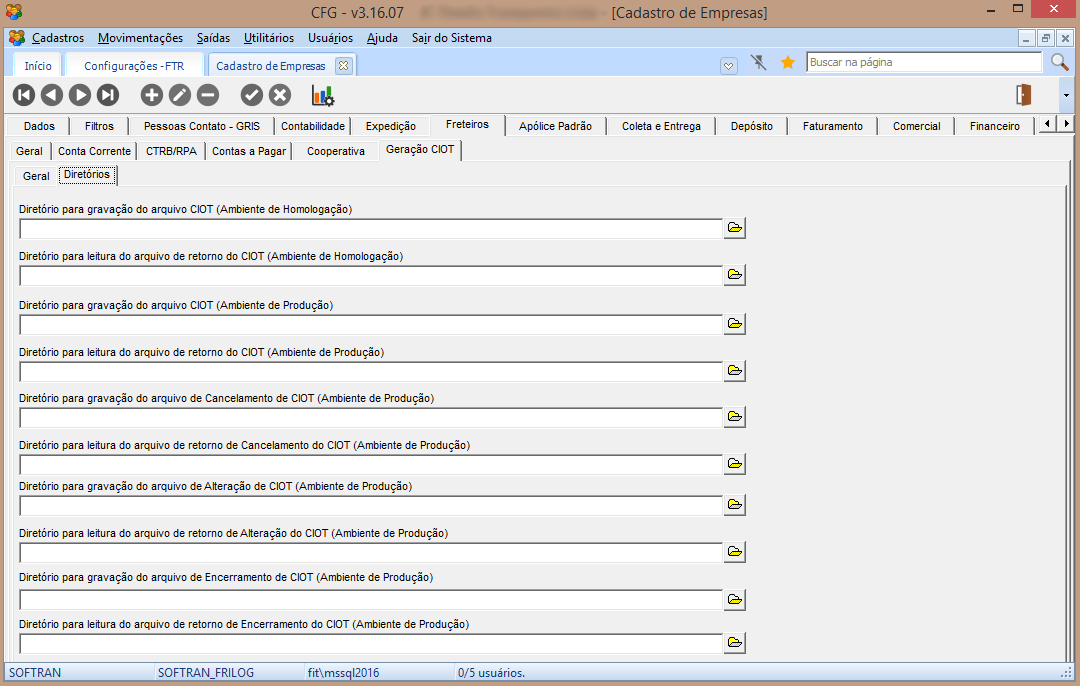 Em CFG > Cadastros > Empresas > Freteiros > Geração de CIOT, nas Guias Geral de Diretórios devem ser configurados os diretórios para integração com NDD.
