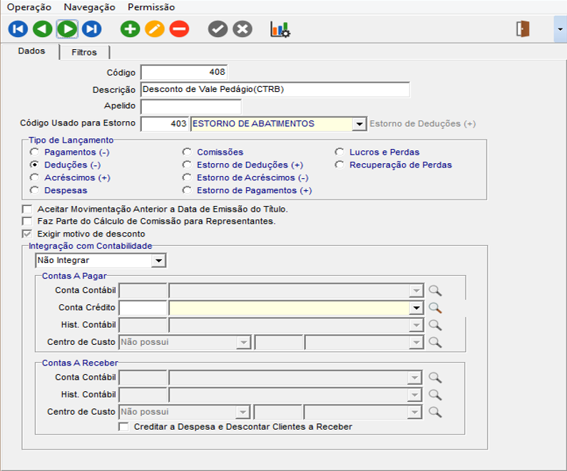 Lançamento financeiro de desconto para o título de pedágio.