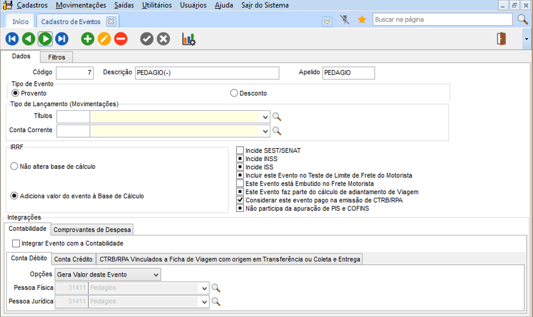 Eventos configurados para Pedágio e Adiantamento de Pedágio e configuração para mover o mesmo valor do Pedágio para o Adiantamento de Pedágio ao gerar o CTRB/RPA pela ficha de viagem.