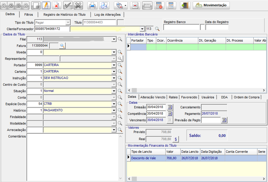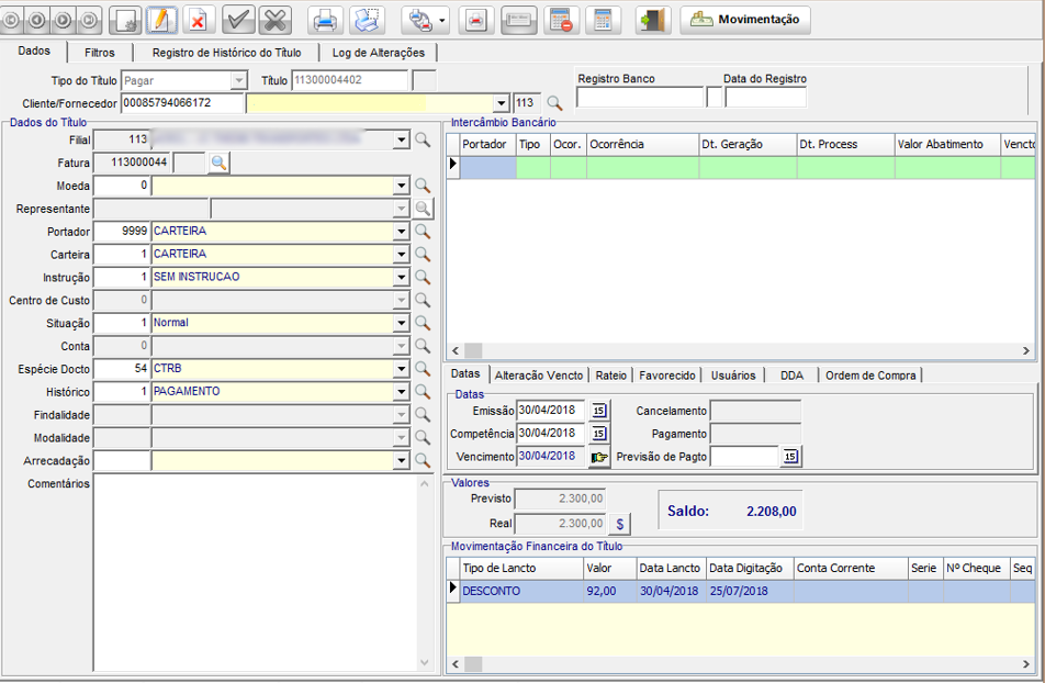 Movimentação financeira de desconto gerada no título