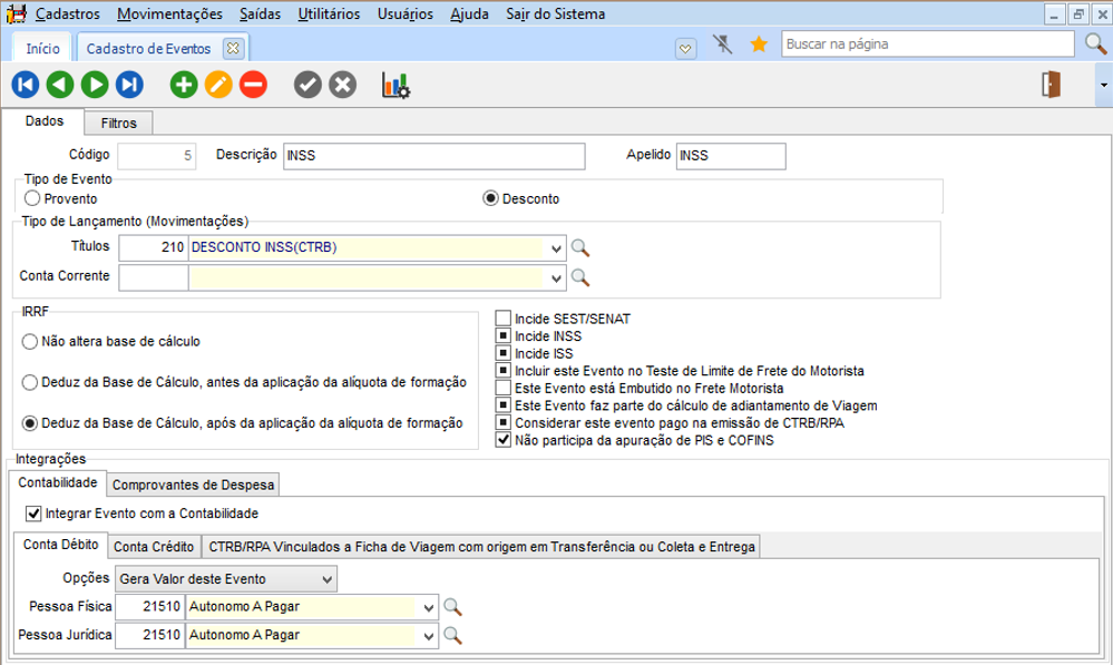 Os impostos são gerados automaticamente na geração da CTRB/RPA e após alguma alteração nos eventos do CTRB/RPA. Os impostos são calculados sobre o valor do frete motorista. O IRRF somente é calculado quando a soma dos valores do CTRB/RPA acumulados no mês alcançar o teto para começar a calcular. Seguem abaixo telas que envolvem estes cálculos. Deve ser configurado nestes eventos, movimentação financeira de desconto para o título de Saldo, para descontar este valor a ser pago para o agregado.