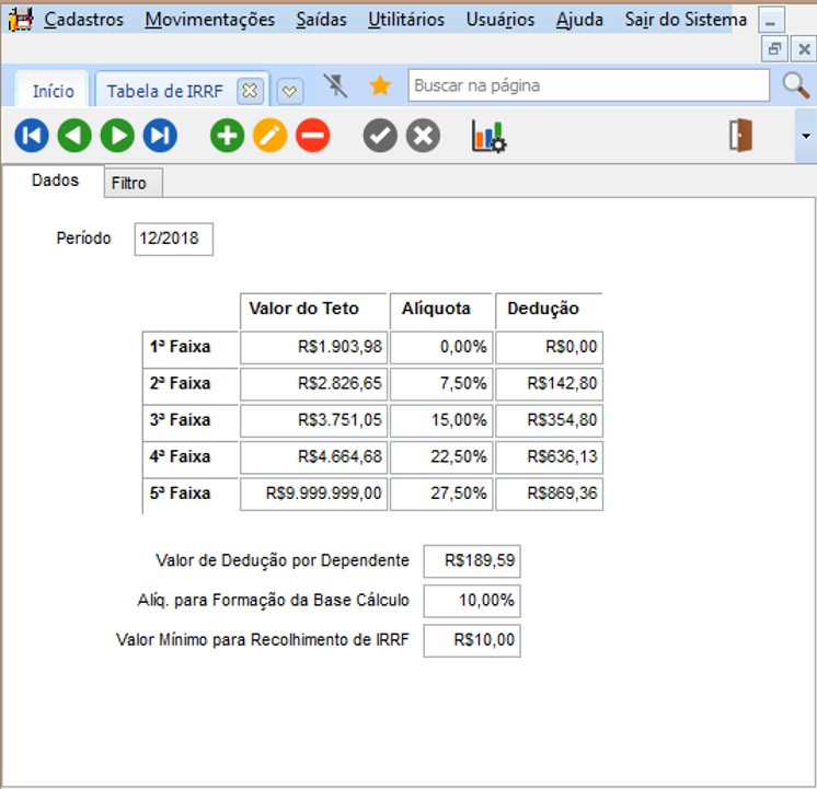 - Cadastro de tabela de IRRF