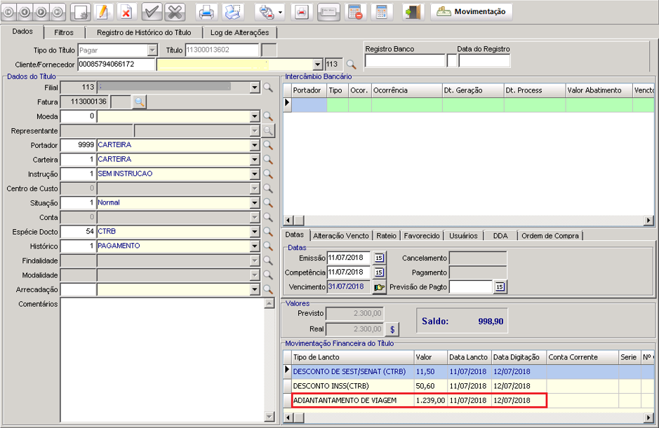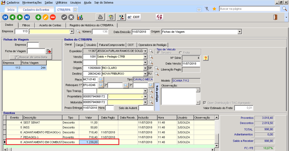 O evento é lançado ao final da viagem antes de realizar o acerto de contas. Este valor atualmente é descontado da fatura e quando possui movimentação financeira de desconto, pois, o motorista recebe na saída do caixa da empresa em espécie este adiantamento.