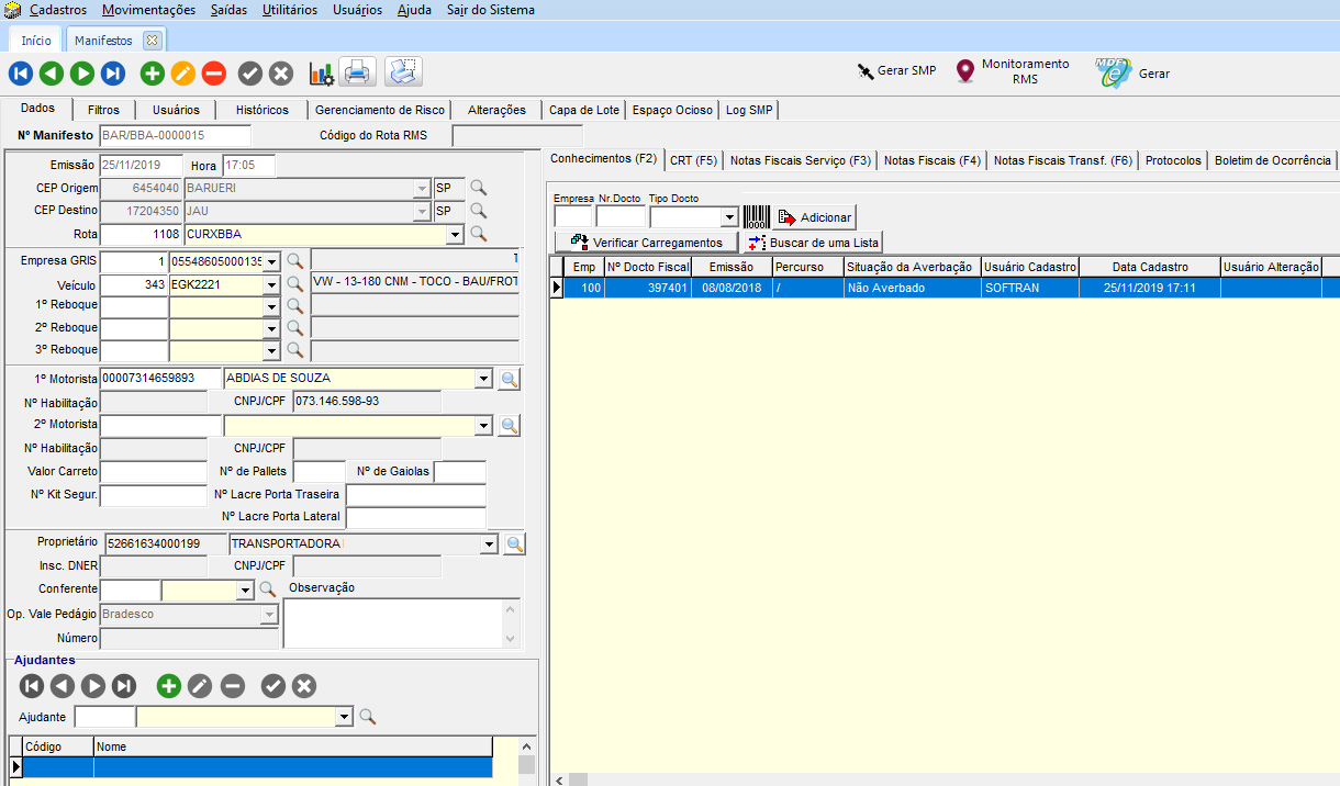 No módulo EXP, em Movimentações > Manifestos, cadastrar e/ou pesquisar um manifesto para que seja vinculado à operação de descarga transferência posteriormente.