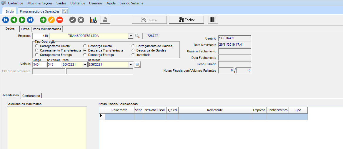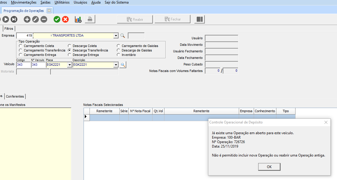 De acordo com a configuração geral do módulo marcada, realizado um novo cadastro de operação Descarga Transferência para o mesmo veículo, apenas com empresa diferente. O sistema permite para empresas diferentes, porém não permite usar o mesmo manifesto em mais uma operação aberta.