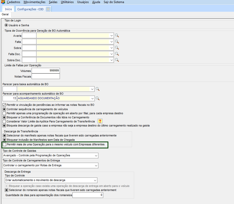 No módulo CFG, em Utilitários > Configurações > TMS > COD – Automação de Depósito, apresenta a configuração Permitir mais de uma Operação para o mesmo veículo com Empresas diferentes.