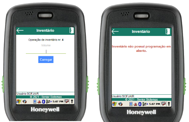 Ao acessar esta rotina, o usuário será informado prontamente caso não haja operação de inventário em aberto. Caso haja, será solicitado que o usuário informe o volume a ser inventariado.