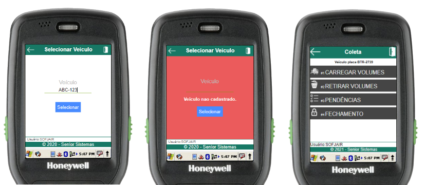Na rotina de selecionar veículo, basta informar a placa do veículo a ser carregado (através do scanner de código de barras ou digitação). Se o veículo estiver aberto e cadastrado para o usuário em questão, o menu de carregamento de coleta do veículo será aberto, caso contrário, um erro será exibido.
