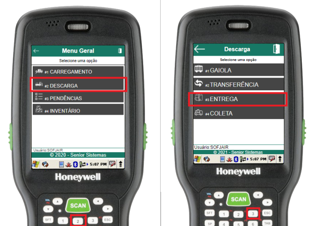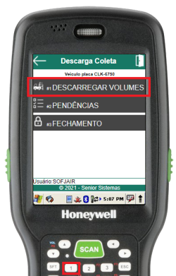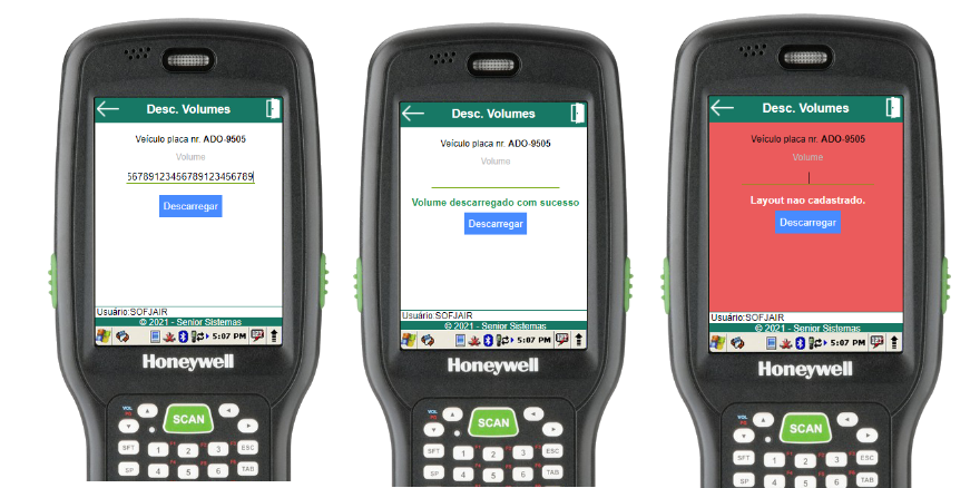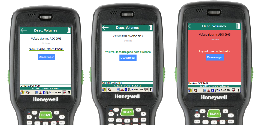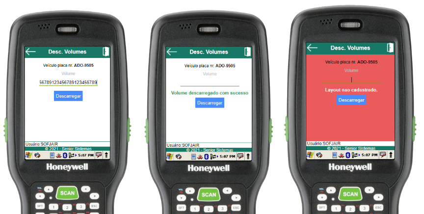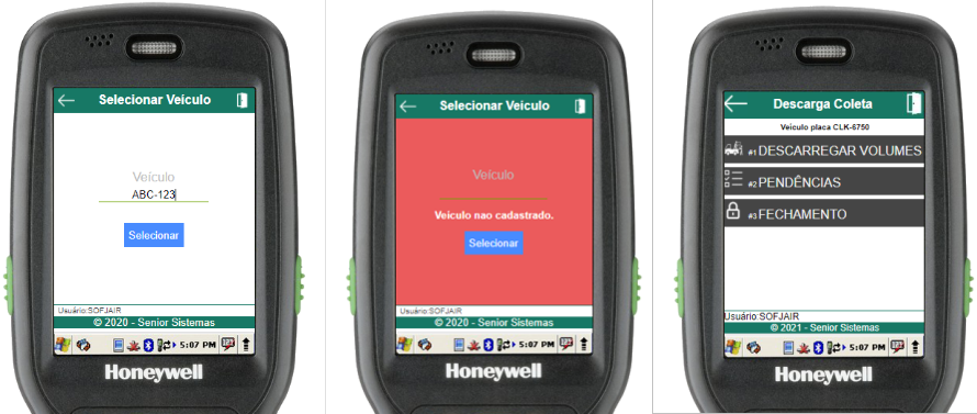 Na rotina de selecionar veículo, basta informar a placa do veículo a ser descarregado (através do scanner de código de barras ou digitação). Se o veículo estiver aberto e cadastrado para o usuário em questão, o menu de descarga do veículo será aberto, caso contrário, um erro será exibido.