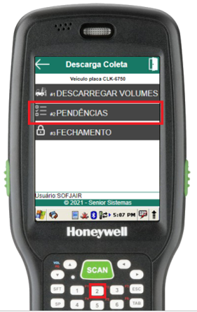 Para conferir os volumes pendentes em uma descarga de gaiola, deve-se acessar a rotina de pendências através do item 2 do menu de descarga da gaiola.