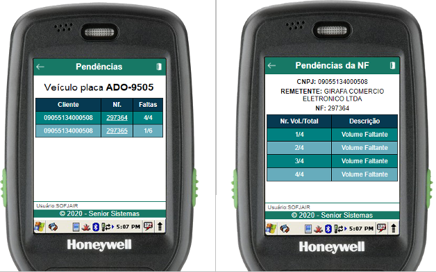 Dentro da rotina de pendências, serão listadas todas as NFs pendentes da descarga da entrega. Para um detalhamento completo dos itens de uma NF pendente, basta clicar na linha da NF a qual se deseja mais detalhes.
